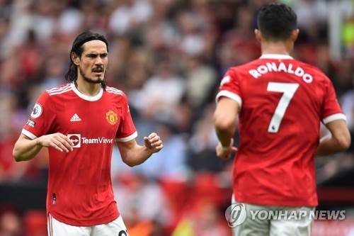 epa09487424 Manchester United players Edinson Cavani (L) and Cristiano Ronaldo (R) react during the English Premier League soccer match between Manchester United and Aston Villa in Manchester, Britain, 25 September 2021. EPA/Peter Powell EDITORIAL USE ONLY. No use with unauthorized audio, video, data, fixture lists, club/league logos or 'live' services. Online in-match use limited to 120 images, no video emulation. No use in betting, games or single club/league/player publications