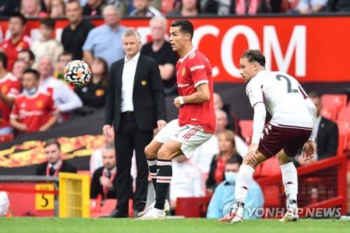 epa09487425 Cristiano Ronaldo (C) of Manchester United in action against Matthew Cash (R) of Aston Villa during the English Premier League soccer match between Manchester United and Aston Villa in Manchester, Britain, 25 September 2021. EPA/Peter Powell EDITORIAL USE ONLY. No use with unauthorized audio, video, data, fixture lists, club/league logos or 'live' services. Online in-match use limited to 120 images, no video emulation. No use in betting, games or single club/league/player publications