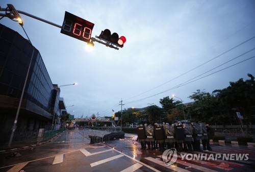epa09487421 Anti-riot police officers secure the area with the paint on the ground after a clash with anti-government protesters, near the Government House in Bangkok, Thailand, 25 September 2021. Anti-government protesters demonstrate in a street rally calling for the ouster of the prime minister. EPA/NARONG SANGNAK