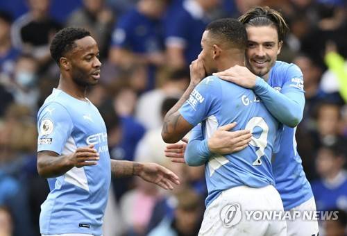epa09487437 Manchester City players (L-R) Raheem Sterling, Gabriel Jesus, and Jack Grealish celebrate after winning the English Premier League soccer match between Chelsea FC and Manchester City in London, Britain, 25 September 2021. EPA/Facundo Arrizabalaga EDITORIAL USE ONLY. No use with unauthorized audio, video, data, fixture lists, club/league logos or 'live' services. Online in-match use limited to 120 images, no video emulation. No use in betting, games or single club/league/player publications