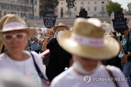 Women hold banners reading "Afghan sisters you're not alone" and "with the Afghan women" during a demonstration in favor of Afghan women's rights, staged by women rights activists, in Rome, Saturday, Sept. 25, 2021. (AP Photo/Andrew Medichini)