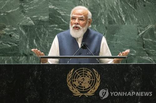 epa09487443 India's Prime Minister Narendra Modi addresses the 76th Session of the U.N. General Assembly in New York City, New York, USA, 25 September 2021. EPA/EDUARDO MUNOZ / POOL