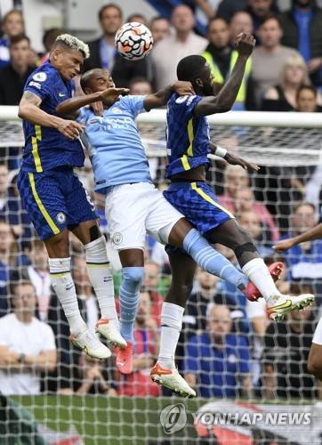 epa09487446 Fernandinho (C) of Manchester City in action against Chelsea players Thiago Silva (L) and Antonio Ruediger (R) during the English Premier League soccer match between Chelsea FC and Manchester City in London, Britain, 25 September 2021. EPA/Facundo Arrizabalaga EDITORIAL USE ONLY. No use with unauthorized audio, video, data, fixture lists, club/league logos or 'live' services. Online in-match use limited to 120 images, no video emulation. No use in betting, games or single club/league/player publications