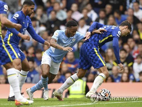 epa09487456 Andreas Christensen (R) of Chelsea in action against Raheem Sterling (C) of Manchester City during the English Premier League soccer match between Chelsea FC and Manchester City in London, Britain, 25 September 2021. EPA/Facundo Arrizabalaga EDITORIAL USE ONLY. No use with unauthorized audio, video, data, fixture lists, club/league logos or 'live' services. Online in-match use limited to 120 images, no video emulation. No use in betting, games or single club/league/player publications