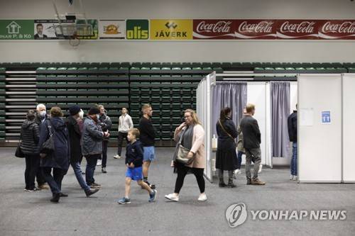 People vote at a local sports complex in Kopavogur, Iceland, Saturday, Sept. 25, 2021. Icelanders are voting in a general election dominated by climate change, with an unprecedented number of political parties likely to win parliamentary seats. (AP Photo/Arni Torfason)