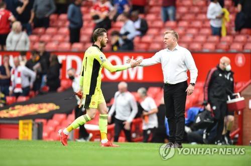 epa09487457 Manchester United's goalkeeper David de Gea (L) shakes hands with Aston Villa manager Dean Smith (R) after the English Premier League soccer match between Manchester United and Aston Villa in Manchester, Britain, 25 September 2021. EPA/Peter Powell EDITORIAL USE ONLY. No use with unauthorized audio, video, data, fixture lists, club/league logos or 'live' services. Online in-match use limited to 120 images, no video emulation. No use in betting, games or single club/league/player publications