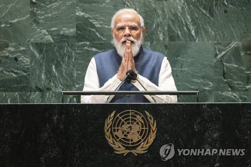 India's Prime Minister Narendra Modi addresses the 76th Session of the U.N. General Assembly at United Nations headquarters in New York, on Saturday, Sept. 25, 2021. (Eduardo Munoz /Pool Photo via AP) POOL PHOTO; MANDATORY CREDIT