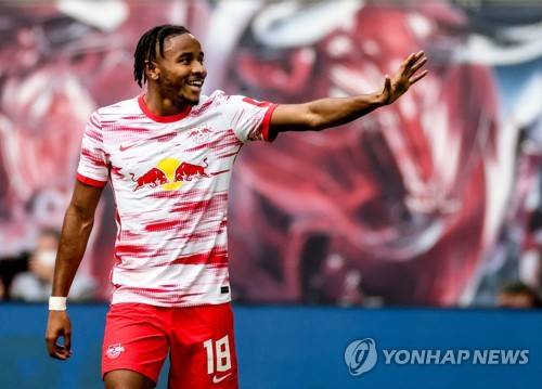 epa09487468 Leipzig's Christopher Nkunku celebrates after scoring the 1-0 during the German Bundesliga soccer match between RB Leipzig and Hertha BSC in Leipzig, Germany, 25 September 2021. EPA/FILIP SINGER CONDITIONS - ATTENTION: The DFL regulations prohibit any use of photographs as image sequences and/or quasi-video.