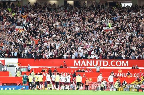 epa09487484 Aston Villa players celebrate with fans after the English Premier League soccer match between Manchester United and Aston Villa in Manchester, Britain, 25 September 2021. EPA/Peter Powell EDITORIAL USE ONLY. No use with unauthorized audio, video, data, fixture lists, club/league logos or 'live' services. Online in-match use limited to 120 images, no video emulation. No use in betting, games or single club/league/player publications