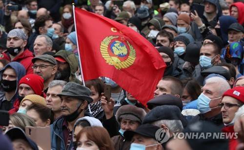 epaselect epa09487220 Russian Communist party supporters attend a protest against results of the Russian Parliamentary elections in Moscow, Russia, 25 September 2021. Representatives from eight parties entered the State Duma, and United Russia won the most votes and secured a constitutional majority. Ella Pamfilova, chairman of the Central Election Commission called the elections valid and noted that according to the results of counting 98.5 percent of the protocols, the turnout was 51.68 percent. EPA/MAXIM SHIPENKOV