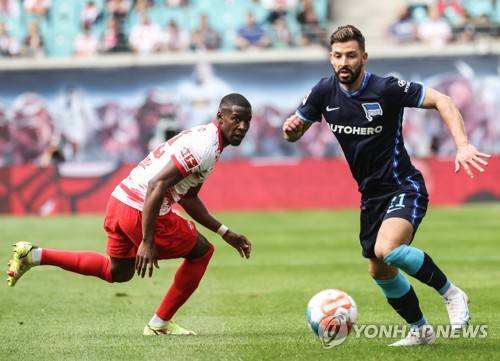 epa09487492 Leipzig's Nordi Mukiele (L) in action against Berlin´s Marvin Plattenhardt during the German Bundesliga soccer match between RB Leipzig and Hertha BSC in Leipzig, Germany, 25 September 2021. EPA/FILIP SINGER CONDITIONS - ATTENTION: The DFL regulations prohibit any use of photographs as image sequences and/or quasi-video.