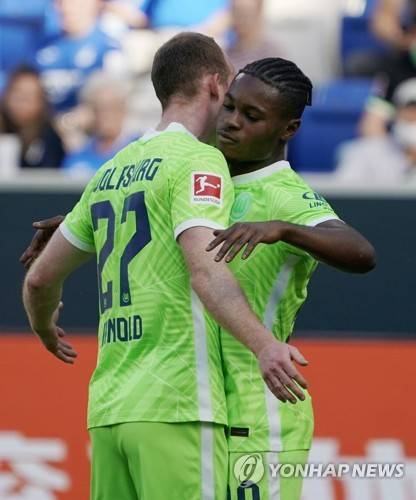 epa09487500 Wolfsburg's Ridle Baku (R) celebrates with teammates after scoring the opening goal during the German Bundesliga soccer match between TSG 1899 Hoffenheim and VfL Wolfsburg in Sinsheim, Germany, 25 September 2021. EPA/RONALD WITTEK CONDITIONS - ATTENTION: The DFL regulations prohibit any use of photographs as image sequences and/or quasi-video.