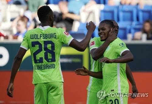 epa09487498 Wolfsburg's Ridle Baku (R) celebrates with teammates after scoring the opening goal during the German Bundesliga soccer match between TSG 1899 Hoffenheim and VfL Wolfsburg in Sinsheim, Germany, 25 September 2021. EPA/RONALD WITTEK CONDITIONS - ATTENTION: The DFL regulations prohibit any use of photographs as image sequences and/or quasi-video.