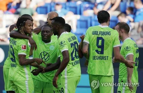 epa09487503 Wolfsburg players celebrate after scoring the opening goal during the German Bundesliga soccer match between TSG 1899 Hoffenheim and VfL Wolfsburg in Sinsheim, Germany, 25 September 2021. EPA/RONALD WITTEK CONDITIONS - ATTENTION: The DFL regulations prohibit any use of photographs as image sequences and/or quasi-video.
