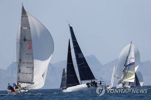 epa09487544 Yachts race during the Spring Regatta in False Bay, Cape Town, South Africa, 25 September 2021. Hosted by the False Bay Yacht Club the annual Spring Regatta sees some of South Africa's premier offshore racing yachts sailing against each other in the Indian Ocean waters of False Bay. EPA/NIC BOTHMA