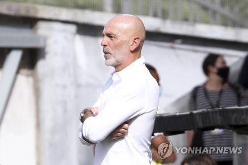 Milan coach Stefano Pioli looks on during the Italian Serie A soccer match between Spezia and Milan, at the Alberto Picco stadium in La Spezia, Saturday, Sept. 25, 2021. (Tano Pecoraro/LaPresse via AP) ITALY OUT;