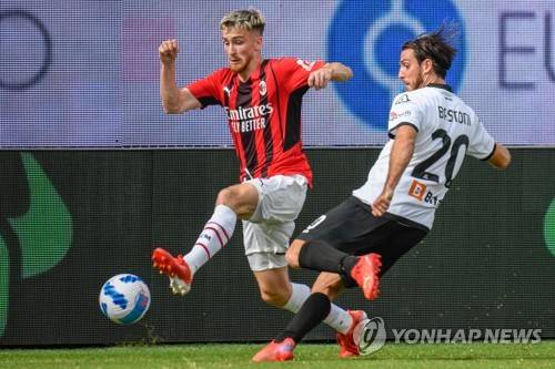 epa09487588 Spezia's Simone Bastoni (R) and Milan's Alexis Saelemaekers (L) in action during the Italian Serie A soccer match between Spezia Calcio and AC Milan at Alberto Picco stadium in La Spezia, Italy, 25 September 2021. EPA/FABIO FAGIOLINI