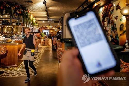epa09487611 Showing a corona ticket prior to a visit to a cafe in The Hague, The Netherlands, 25 September 2021. Many coronavirus measures are being released in The Netherlands. For example, keeping a distance of 1.5 meters is no longer mandatory, the catering industry can open again with maximum capacity and people must show a corona ticket when visiting catering and events. EPA/KOEN VAN WEEL