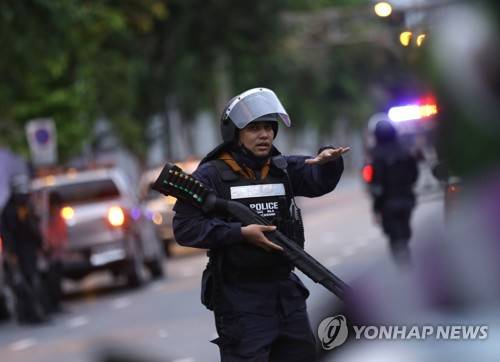 epa09487619 Anti-riot police officer with a rubber bullet gun to control the area during the anti-government protests rally near the Government House in Bangkok, Thailand, 25 September 2021. Anti-government protesters demonstrate in a street rally calling for the ouster of the prime minister. EPA/NARONG SANGNAK