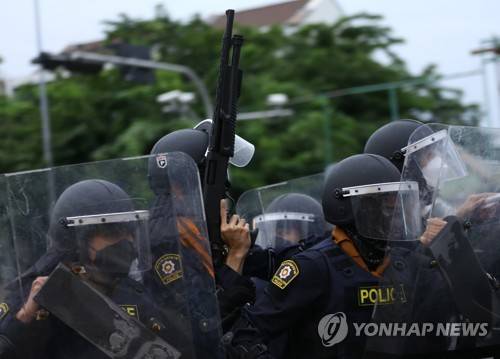 epa09487622 Anti-riot police officers with a rubber bullet gun to control the area during the anti-government protests rally near the Government House in Bangkok, Thailand, 25 September 2021. Anti-government protesters demonstrate in a street rally calling for the ouster of the prime minister. EPA/NARONG SANGNAK