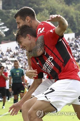 Milan's Daniel Maldini celebrates with teammate Pietro Pellegri after scoring his side's first goal during the Italian Serie A soccer match between Spezia and Milan, at the Alberto Picco stadium in La Spezia, Saturday, Sept. 25, 2021. (Tano Pecoraro/LaPresse via AP) ITALY OUT;