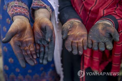 Kashmiri villagers show their hands stained by cleaning and shelling walnuts in Budgham area, northeast of Srinagar, Saturday, Sept. 25, 2021. (AP Photo/Dar Yasin)