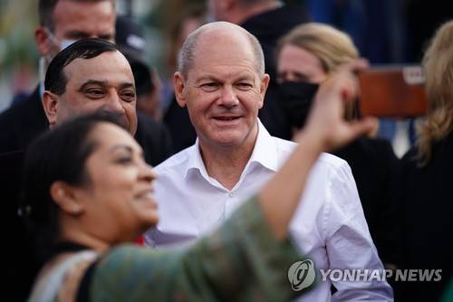 epa09487657 German Minister of Finance and Social Democratic Party (SPD) top candidate for the federal elections Olaf Scholz poses for a selfie during the campaign closing of the regional Social Democratic Party (SPD) in Potsdam, Germany, 25 September 2021. German Minister of Finance and Social Democratic Party (SPD) top candidate for the federal elections Olaf Scholz runs for a direct candidate mandate in his home constituency in Potsdam, Brandenburg, during the German federal elections on 26 September 2021. EPA/CLEMENS BILAN