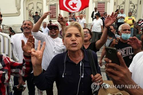 epa09487666 Supporters of Tunisia's President Kais Saied shout slogans during a protest to ask the President to organize a referendum for a new constitution in Tunis, Tunisia, 09 September 2021. Tunisian President Saied suspended the country's parliament and dismissed the Prime Minister, Hichem Mechichi on 25 July 2021. EPA/MOHAMED MESSARA