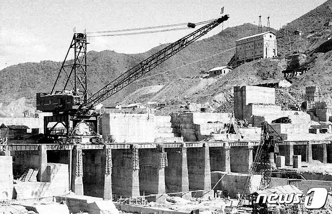 (평양 노동신문=뉴스1) = 북한 노동당 기관지 노동신문은 26일 "전 세대들의 투쟁정신, 투쟁기풍을 따라 배우자"며 북한이 처음으로 건설한 장자강발전소 공사 현장 사진을 게재했다.