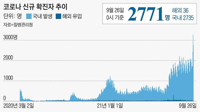 25일 국내 코로나 신규 확진자 수는 2771명이라고 25일 중앙방역대책본부가 밝혔다. 국내 지역발생은 2735명, 해외 유입 사례는 36명이다. 전날 역대 최다치(3273명)를 기록한 데 이어 역대 두 번째로 많은 확진자가 발생했다.