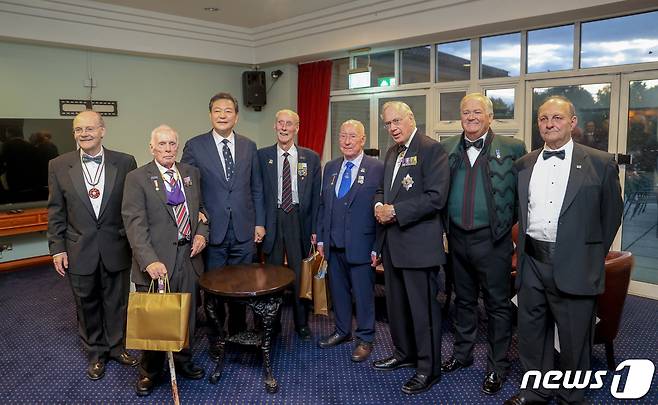 (서울=뉴스1) = 임진강전투 70주년을 맞아 영국 참전용사들을 위로하기 위해 영국을 방문중인 황기철 국가보훈처장이 25일 저녁(현지시각) 영국 글로스터에서 열린 임진강전투 70주년 기념만찬에서 리처드 알렉산더 월터 조지 글로스터 공작과 리차드 그레이엄 글로스터 국회의원, 토니 아이레스 임진70그룹 의장 및 주요내빈과 함께 기념촬영을 하고 있다. (국가보훈처 제공) 2021.9.26/뉴스1