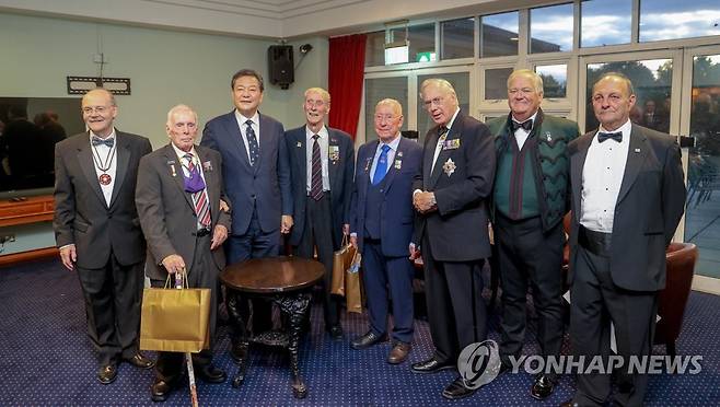 (서울=연합뉴스) 황기철 국가보훈처장(왼쪽 세 번째)이 25일(현지시간) 영국 글로스터에서 열린 '임진강전투 70주년 기념만찬'에 참석해 리처드 알렉산더 월터 조지 글로스터 공작과 리처드 그레이엄 글로스터 국회의원, 토니 아이레스 임진70그룹 의장 및 주요내빈들과 기념촬영을 하고 있다. 2021.9.26