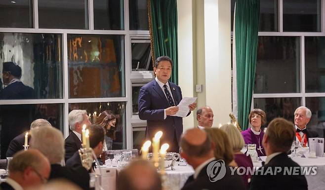 (서울=연합뉴스) 황기철 국가보훈처장이 25일(현지시간) 영국 글로스터에서 열린 '임진강전투 70주년 기념만찬'에 참석해 기념사를 하고 있다. 2021.9.26