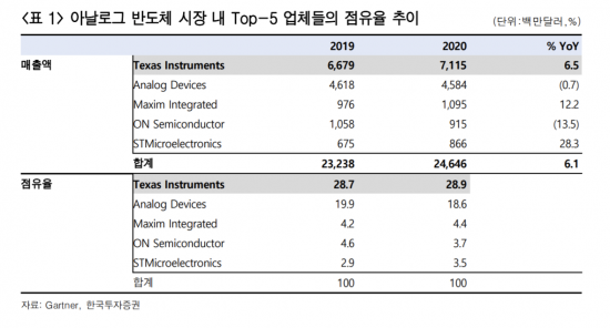 아날로그 반도체 시장 내 TI의 점유율은 지난 2019년 28.7%에서 지난해 28.9%로 확대된 가운데 올해 상반기 매출액 증가율도 기타 경쟁사들의 증가율을 상회하면서 추가적인 점유율 상승이 예상된다. 상반기 매출액 증가율을 보면 TI는 전년 대비 35% 성장했는데 이는 경쟁사인 아날로그장치(23%), ON세미콘덕터(27%)를 웃도는 수치다.