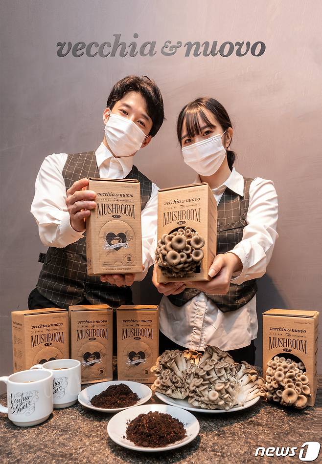 (서울=뉴스1) = 26일 서울 중구 신세계백화점 본점 내 이탈리안 레스토랑 ‘베키아에누보’에서 신세계푸드 직원들이 커피박으로 만든 친환경 버섯 재배 키트를 소개하고 있다. 소비자들과 자원 재사용에 대한 의미를 공감하기 위해 신세계푸드가 선보인 친환경 버섯 재배 키트는 ‘베키아에누보’ 매장에서 커피를 만들때 사용한 원두의 찌꺼기를 수거해 만든 것으로, 가정에서 쉽게 느타리 버섯을 재배할 수 있다. 26일부터 신세계백화점 본점, 강남점, 대전점 내 베키아에누보에서 7만원 이상 식사고객에게 증정한다. (신세계푸드 제공) 2021.9.26/뉴스1