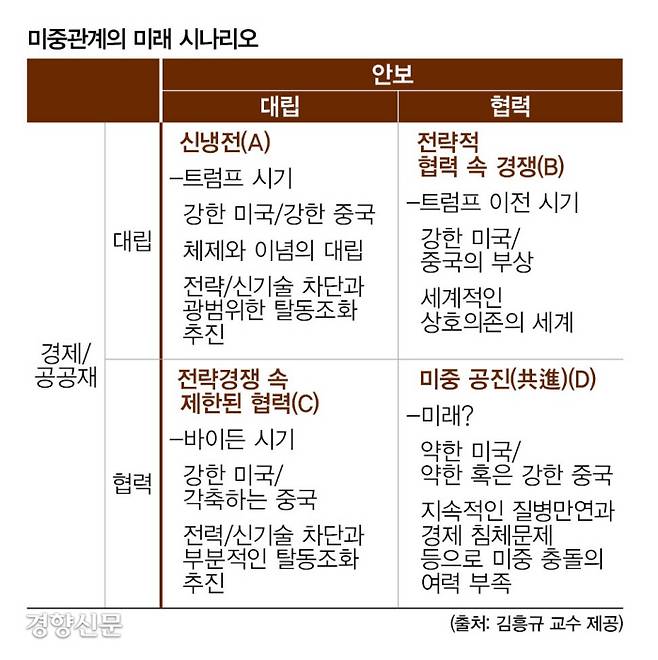 “A나 D시나리오는 한국의 이해에 부합하지 않을 개연성이 크다. 중국과 전면적 충돌을 하거나 중국의 영향권 내에 의도치 않게 편입되는 상황이다. 따라서 한국의 외교안보경제 정책은 시나리오 C, 즉 바이든 행정부의 대외정책이 잘 유지되도록 돕고 보완해주는 것이라는 결론에 도달한다. 그러나 미국 자체적으로 이를 유지하기 쉽지 않다. 대단히 유동적이고 불안정한 상황이다. 미국의 동맹국들은 물론이고 중견국들의 창의적이고 적극적인 노력과 협력이 없다면 혼돈이 빠르게 증가할 수 있다. 한국은 시나리오 C를 구축하려고 최선을 다하는 가운데 시나리오 A, 그다음으로 D로의 전이 가능성에 대비해야 한다. 지난 3월 22일 화춘잉 중국 외교부 대변인이 미국이 알래스카회담에서 하나의 중국 원칙을 인정했다고 언급한 것은 시나리오 D로의 전이 개연성도 충분하다는 것을 잘 보여준다.”