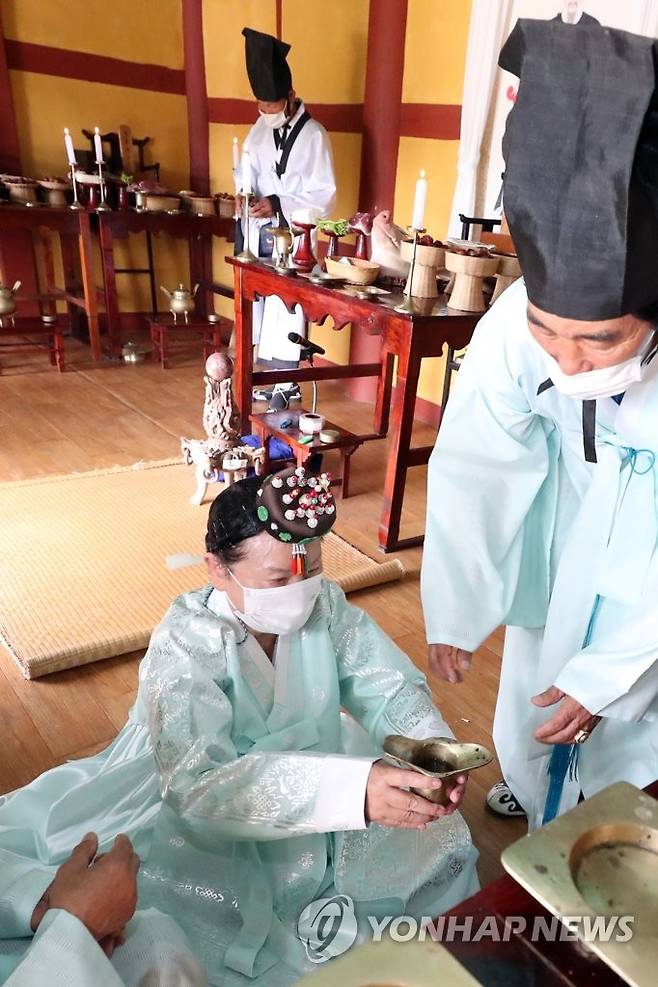 (장성=연합뉴스) 정회성 기자 = 26일 오전 전남 장성군 장성읍 봉암서원에서 열린 추향제에서 초헌관에 임명된 정춘자 성균관여성유도회장이 술잔을 올리고 있다. 이번 추향제에서는 봉안서원 320여 년 역사상 처음으로 여성 3명이 헌관으로 참여했다. 2021.9.26