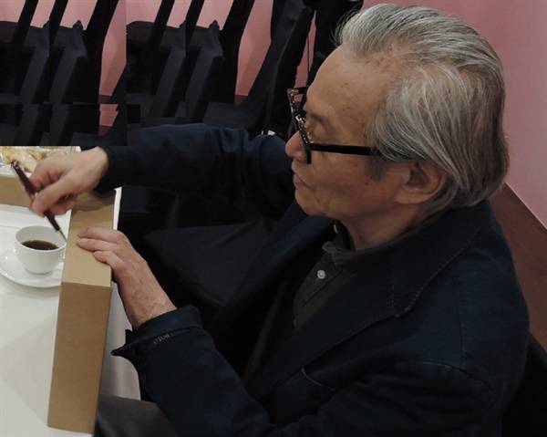| ▲ 이건용 작가와 기자들과 대면에서 그는 유머와 시연을 통해 원활한 소통을 추구한다. 작업 과정도 보여주다 |