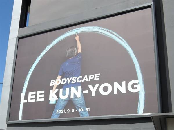 | ▲ 갤러리현대(신관) 입구 이건용 전시 홍보판. '신체의 풍경(보디스케이프): 온몸을 축으로 반원 그리기'(76-8번) |