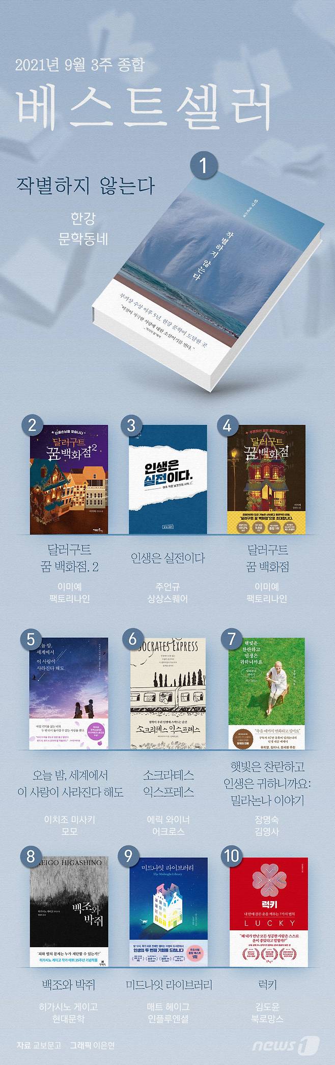 교보문고가 발표한 9월 셋째 주 온·오프라인 종합 베스트셀러 집계 순위에 따르면 한강의 5년 만의 신작 '작별하지 않는다'는 직전 주에 이어 또 다시 정상을 차지, 2주째 왕좌를 지켰다. '작별하지 않는다'는 제주 4·3사건을 다룬 작품으로, 1부 '새', 2부 '밤', 3부 '불꽃'으로 구성됐다.
