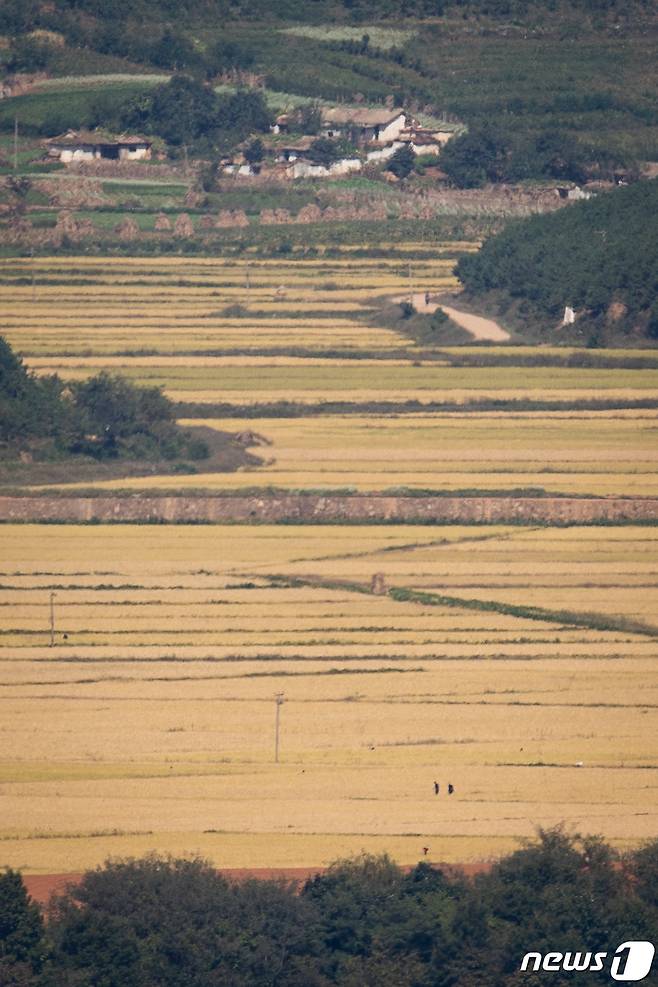 (파주=뉴스1) 유승관 기자 = 김여정 북한 노동당 부부장이 연이틀 문재인 대통령의 종전선언 제의에 '긍정 담화'를 내놓은 가운데 26일 경기 파주 오두산통일전망대에서 바라본 북한 개풍군 마을에서 주민들이 황금들녘을 거닐고 있다.