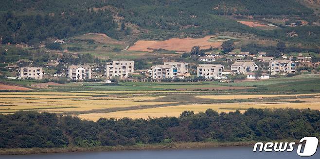 (파주=뉴스1) 유승관 기자 = 김여정 북한 노동당 부부장이 연이틀 문재인 대통령의 종전선언 제의에 '긍정 담화'를 내놓은 가운데 26일 경기 파주 오두산통일전망대에서 바라본 북한 개풍군 마을에 적막이 흐르고 있다.