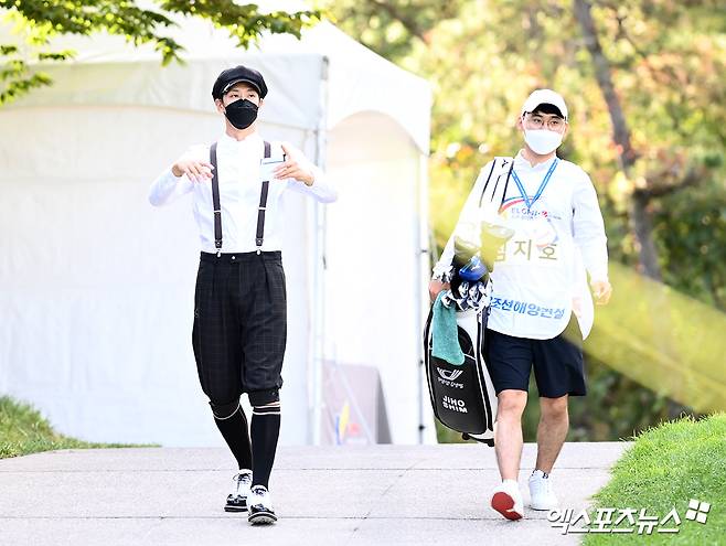 (엑스포츠뉴스 안산, 고아라 기자) 26일 경기도 안산 아일랜드 CC(파72·6,613야드)에서 열린 한국여자프로골프(KLPGA) 투어 '엘크루-TV조선 프로 셀러브리티 2021'(총상금 6억 원, 우승상금 1억 800만 원) 최종라운드, 심지호가 1번홀 티샷을 위해 이동하고 있다.