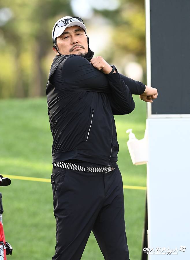 (엑스포츠뉴스 안산, 고아라 기자) 26일 경기도 안산 아일랜드 CC(파72·6,613야드)에서 열린 한국여자프로골프(KLPGA) 투어 '엘크루-TV조선 프로 셀러브리티 2021'(총상금 6억 원, 우승상금 1억 800만 원) 최종라운드, 김영호가 1번홀 티샷을 준비하고 있다.