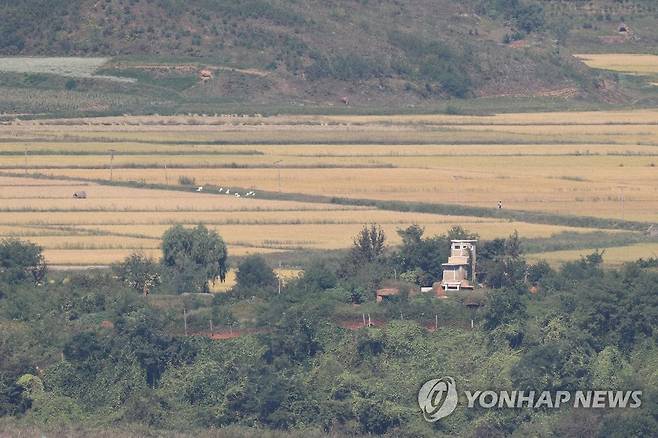 (파주=연합뉴스) 임병식 기자 = 26일 경기도 파주시 오두산 통일전망대에서 바라본 북한 황해북도 개풍군에서 들녘이 노랗게 물들고 있다. 2021.9.26