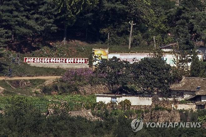 (파주=연합뉴스) 임병식 기자 = 26일 경기도 파주시 오두산 통일전망대에서 바라본 북한 황해북도 개풍군에 '위대한 김정은 동지의 혁명사상으로 철저히 무장하자'라는 붉은색 선전 구호가 눈길을 끌고 있다. 2021.9.26