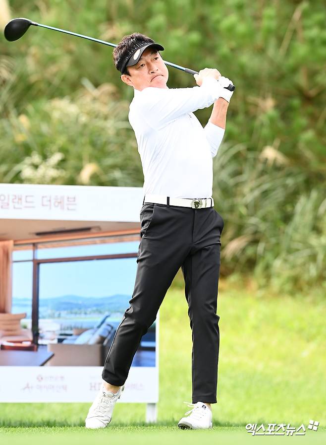 (엑스포츠뉴스 안산, 고아라 기자) 26일 경기도 안산 아일랜드 CC(파72·6,613야드)에서 열린 한국여자프로골프(KLPGA) 투어 '엘크루-TV조선 프로 셀러브리티 2021'(총상금 6억 원, 우승상금 1억 800만 원) 최종라운드, 이재룡이 1번홀 티샷을 날리고 있다.