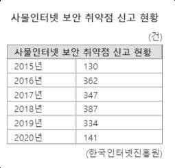 하지만 홈네트워크 보안에 대한 문제는 심각하다. 한국인터넷진흥원에 따르면 IoT 관련 보안 취약점 신고건수는 최근 5년간 1751건에 달했다. 2015년 130건에서 2016년 362건으로 급증했다. 이후 해마다 300건 이상 접수되고 있다.