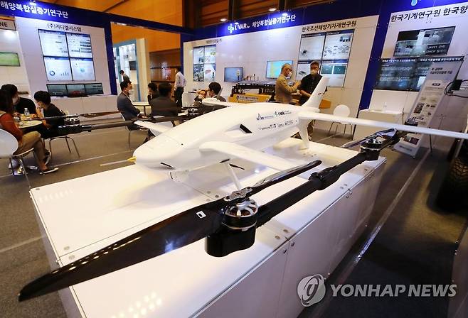 (서울=연합뉴스) 이재희 기자 = 26일 오전 서울 강남구 코엑스에서 열린 '2021 무인이동체산업엑스포'의 한 부스에 드론이 전시돼 있다. 2021.9.26