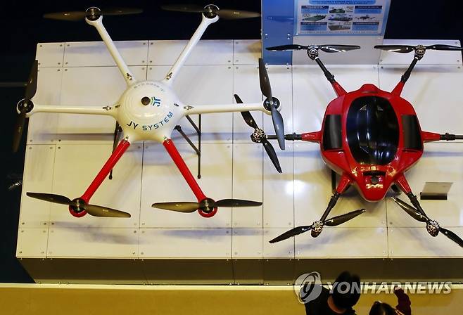 (서울=연합뉴스) 이재희 기자 = 26일 오전 서울 강남구 코엑스에서 열린 '2021 무인이동체산업엑스포'에서 관람객들이 전시 드론을 살펴보고 있다. 2021.9.26